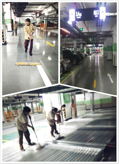 改造施工結(jié)束后,原本地上施工后到處是油漆、灰塵、污漬等。2、3號(hào)樓的保潔們先用鏟子鏟去頑固的附著物,然后用水槍仔細(xì)沖洗,接著用大推布一遍一遍的推擦,眼看著車(chē)庫(kù)地面慢慢露出了本來(lái)的顏色,變得越來(lái)越亮,最后再用拖把和抹布把角角落落都擦的干干凈凈。