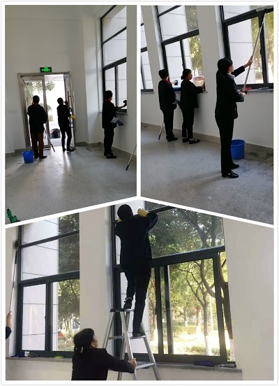 收到竣工通知,主管立即安排物業(yè)人員對現(xiàn)場清理收尾。保安和維修師傅把原來封住入口的木板進(jìn)行拆除,將施工隊(duì)的殘余材料垃圾一起清理拖走。保潔員們拿來掃把、塵推及抹布等工具給改造后的樓梯間進(jìn)行一次大掃除。人多力量大,很快地面墻面及玻璃門都被清理的很干凈。最后開始清理窗戶玻璃,由于玻璃太高夠不著,保潔班長搬來梯子,擦了一遍又一遍,連一條小縫都不放過。