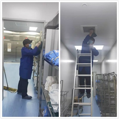 接到護士長的電話后,項目內(nèi)科主管馬上聯(lián)系機動王師傅,跟他說明情況后,王師傅完成手頭工作后就去供應(yīng)室?guī)兔。因為?jīng)常去那邊幫忙,所以王師傅一進屋就熟練地開始擦空調(diào)、燈具還有其他的平時打掃衛(wèi)生時夠不到的設(shè)施。