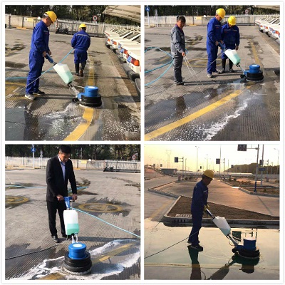 以前,清洗場地地標線都是人工進行清洗,不僅需要預備十幾個保潔員,且因保潔員在用地刷刷的時候用力有限,清刷出來的地標線仍灰蒙蒙的。為此,物業(yè)在星期五下午不考訓時,將新配備的洗地機進行了初步試用。項目經(jīng)理親自進行教授此機器用法及使用時需注意事項,考慮到需要掌控機器的力較大,保潔員都是女士,無法將其掌控,便安排了一個維保員來進行學習及后期的清洗工作。在學習會機器的使用方法后,便先對一段黃線地標線進行清洗,與未清洗的地標線進行對比,確實干凈很多,也亮了很多?吹叫Ч,便對E區(qū)整場地的地標線進行清洗。雖說使用機器洗方便,不過,因場地設計特殊性,還是安排了3-4名保潔員在機器清洗后,一個用水管清水進行沖洗,其他保潔員用大竹掃帚進行清掃,防止積水。
