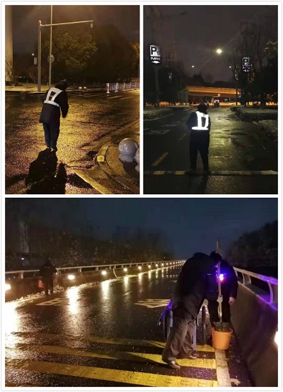 晚上22:00開(kāi)始,在高正集團(tuán)物業(yè)管理員的帶領(lǐng)下,保安隊(duì)員分成三個(gè)小組,一組保持日常秩序管控;二組對(duì)管轄范圍內(nèi)積水進(jìn)行清理以防結(jié)冰;三組對(duì)廣場(chǎng)、停車場(chǎng)、外圍路段進(jìn)行撒鹽。今年相比較往年撒鹽是比較困難的,沒(méi)有了城管的皮卡車,隊(duì)員用水桶接著工業(yè)鹽各處分撒。氣溫驟降,寒風(fēng)凌冽,物業(yè)人一把一把的將熱情揮灑在了雪地上,讓落雪的美景再一次得到升華...