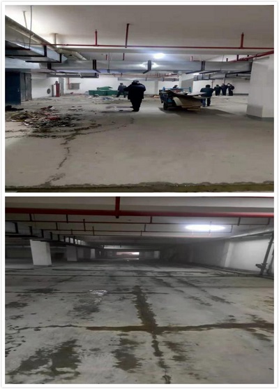此次清掃工作量較大,物業(yè)保潔主管提前對整個清掃工作進行了安排部署,主要通過對地面沖洗去除頑固污漬及灰塵、清理一些無用的雜物及垃圾。當(dāng)天下午,保潔員們在主管的帶領(lǐng)下開展清掃活動,大家手拿掃把及沖洗水管,全身心投入到大掃除中,齊心協(xié)力,干的熱火朝天,顧不上被水濺濕的鞋子汗?jié)竦囊陆,仍舊不放過任何一個衛(wèi)生死角,經(jīng)過一番努力,地下車庫煥然一新。