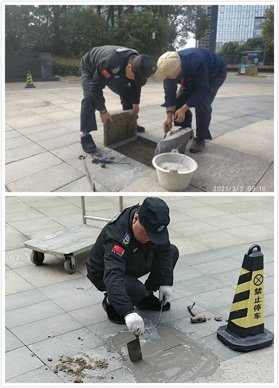 高正集團水務大廈管理部在每日自檢自查工作中發(fā)現(xiàn)南門廣場上水泥道板多處開裂,踩上去松動作響,F(xiàn)在只是小小的松動,如果不及時修理裂紋會越來越大,導致其它道板一起破碎。管理部把這一問題向保安隊長反映,在水務工作了十幾年的保安隊長勤勤懇懇,早就把水務當成了家,對水務的一磚一瓦都了如指掌。他二話不說立即拿來工具和水泥,圍著大廈四周轉(zhuǎn)一圈查漏補缺看看哪里還有類似的道板開裂松動,準備一起用水泥修補好。
