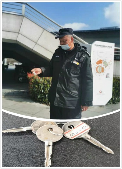 在這寒風(fēng)刺骨的冬季,保安員夏慧國同志跟往常一樣,在自己負(fù)責(zé)區(qū)域內(nèi)站崗、巡邏。為每一位騎電動(dòng)車的市民指示合理的停車位,為不明方向的路人引導(dǎo)他們所要去往的目地點(diǎn)。當(dāng)他巡查到天橋時(shí),撿到鑰匙一串。在原地等了一段時(shí)間后,并沒有發(fā)現(xiàn)失主前來尋找,加上自己本崗位的工作需要,于是將鑰匙交到物業(yè)辦公室內(nèi)勤手中,并拍照上傳保安群,并告知到家,如有失主尋找鑰匙通知他來辦公室領(lǐng)取。