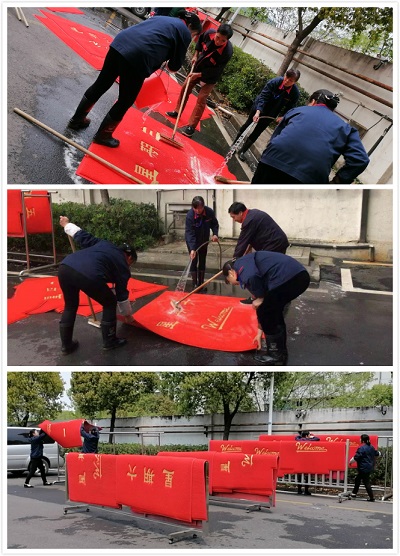 大家分工合作,迅速的投入到清洗地毯行列中去。從樓上用推車把地毯推下來,拿到后廣場上,一塊塊鋪好。大家分工明確共同協(xié)助,沖水、刷洗、晾曬,工作有條不紊。時(shí)間一分一秒過去,大家清洗地毯工作也逐漸收尾,通過大家合作努力,每一塊地毯都洗的干干凈凈。甲方領(lǐng)導(dǎo)看過后對效果特別滿意,笑著說用了幾年的電梯地毯被你們洗的像新買的一樣。