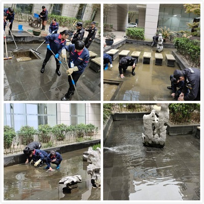 濃濃的春意,就連葉子也感知到了,新老更替,一片片葉子伴隨著陣陣春風(fēng),飄入景觀池水中,池底也覆著一層薄薄泥灰,物業(yè)主管組織員工一起清理景觀池。