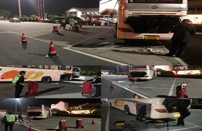 保安順著汽油的味源尋找,當(dāng)找到國旗臺前時,看到一輛大客車的后箱打開一路漏著汽油。執(zhí)勤保安發(fā)現(xiàn)異常后立即跑步到崗?fù)つ脺缁鹌,一邊利用對講機(jī)匯報當(dāng)班負(fù)責(zé)人,一邊疏散人員。當(dāng)班負(fù)責(zé)人得知后立即組織其他保安人員一起參加險情處理,負(fù)責(zé)人安排保安開啟消防栓,引來消防水,做好一切措施。負(fù)責(zé)人親自查看漏油,在確保漏油的情形下,迅速安排保安清理現(xiàn)場并報告相關(guān)部門。