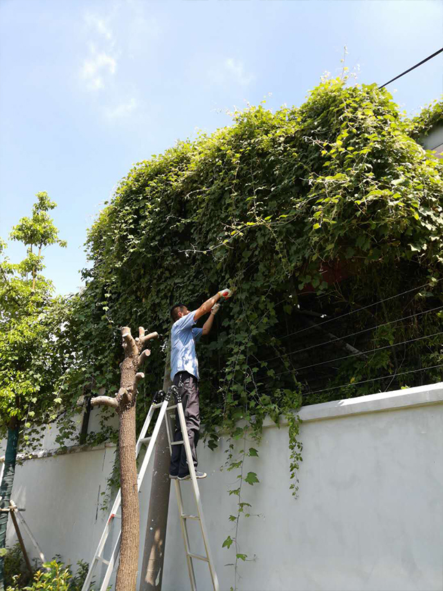 特檢院隔壁汽車4S店圍墻內長了一株野生爬山虎,適應性強生命力旺盛的爬山虎生長速度快,順著圍墻肆意攀爬,已經嚴重影響到特檢院電子圍欄的正常使用。爬山虎的枝條把電子圍欄線給纏繞起來,值班室警鈴大作,經常要拿梯子爬到圍墻上對繞在電子圍欄線上的爬山虎枝條進行修剪,多雨季節(jié)更是生長迅速,給修剪帶來了一定的麻煩。