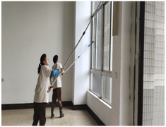 常州通用自來水廠有個定期的季度泵房評比。7月又一季度的評比在即,我部物業(yè)保潔姐姐們?yōu)轫椖吭u比中不失分,在室外36°,泵房室內(nèi)50°之上的高溫下,開始了清掃工作。保潔們在主管帶領(lǐng)下分工分明:高空撣塵,玻璃刮塵,清理窗槽,欄桿清理。。。全身心的投入工作中,齊心協(xié)力,干的熱火朝天,絲毫顧不得高溫下濕透的衣服褲子,不放過每一個角落每一個死角。一天一天,在臨近評比日子的到來,保潔姐姐們犧牲禮拜天自己的休息時間,加班加點完成了西石橋水廠和魏村水廠近1萬平方米面積的所有衛(wèi)生工作,確保了水廠物業(yè)所在項目的評比最高分,獲得了甲方的好評。