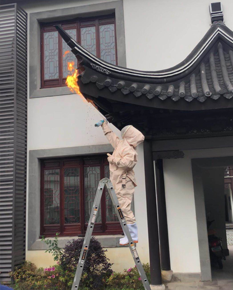 對(duì)于一些不是位置太偏的蜂窩我們自行處理,戴好防護(hù)工具,殺蟲(chóng)劑、打火機(jī),一噴一個(gè)準(zhǔn)。對(duì)于蜂窩位置較有難度的,為安全起見(jiàn),交給消防人員處理!岸〞r(shí)炸彈”終于成功鏟除。