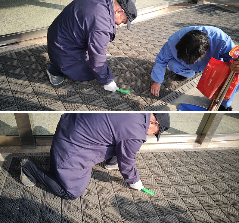 “好醫(yī)管”醫(yī)療事業(yè)部啟東市人民醫(yī)院項(xiàng)目部,5月18日下午,趁著休息天人少,機(jī)動(dòng)師傅計(jì)劃把內(nèi)科西門的防滑墊子清潔一下。他拿上保潔工具,叫上大廳里的保潔阿姨,兩個(gè)人開始對防滑墊子進(jìn)行徹底的打掃。他們先把防滑墊子移到臺階上,然后用手拍打墊子,使卡在墊子里的灰塵和臟東西全部掉下來,接著阿姨把地上的臟東西先清理干凈,然后兩個(gè)人把防滑墊子拖回原地,由于有些絨毛當(dāng)時(shí)不能被拍打下來,所以接下來清理絨毛的任務(wù)只能慢慢地解決了。只見他們用手指一點(diǎn)一點(diǎn)地把絨毛從墊子的夾縫間摳出來,還有些害羞的躲在角落里不肯出來的,王師傅只能動(dòng)用武力——使用鞋刷把它們?nèi)坷蟻。蹲的時(shí)間長了,腿有點(diǎn)酸了,他們就站一會(huì)兒,休息了一下又接著干。最后終于把那么一大張的防滑墊子徹底清理干凈了?粗敲锤蓛舻姆阑瑝|子,又看看他們又臟又紅的手,真心的為他們的點(diǎn)贊!