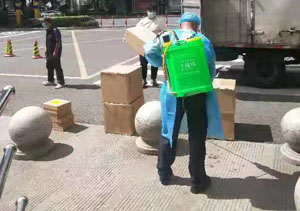 對(duì)于醫(yī)院里來的物料物資也一樣把控嚴(yán)格。每當(dāng)來了物料,甲方會(huì)先通知我們物業(yè)的機(jī)動(dòng)人員對(duì)物資進(jìn)行全面消毒。駕駛員先把貨卸下來放在空地上,王師傅接到通知后先去把泡騰片調(diào)和到500mg/l濃度后倒入噴霧器,再穿上準(zhǔn)備好的隔離衣,戴上帽子開始消毒。