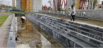 首先管理團(tuán)隊(duì)組織保潔員們用刷子和地刮,對(duì)噴泉池進(jìn)行大面積清洗,再用抽水機(jī)把污水往外抽,同時(shí)時(shí)刻留意水下的腐爛物和垃圾,最后有刷洗不干凈的淤泥,再使用專業(yè)的鏟子進(jìn)行精細(xì)化處理。為了讓自來水水廠的噴泉再現(xiàn)壯觀美景,保潔員們一個(gè)個(gè)被污泥和污水,弄得又臭又臟,但他們沒有一句怨言。在項(xiàng)目組全體員工的努力下,水池又露出了干凈的“笑臉”。