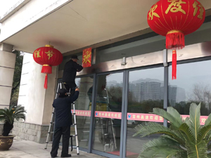 管理中心的大門是常高速的門面,兩個(gè)大紅燈籠一掛上,立馬就有了新春氣氛。兩位保安員分工明確,一個(gè)在梯子上安裝燈籠和中國(guó)結(jié),一個(gè)在遠(yuǎn)方指揮,就這樣兩人相互配合,終于將“門面”裝飾完畢。