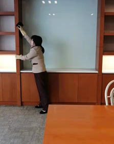 21樓是水務(wù)大廈空置率最高的一個(gè)樓層,甲方要求我們把21樓朝南的房間全部清理出來。說干就干,21樓總共八個(gè)房間,房間的地毯,窗簾,所有的柜子,門窗統(tǒng)統(tǒng)都要清理,由于房間一直空著,自然沒有人前去管理,污垢、灰塵、蜘蛛網(wǎng)到處都是,阿姨們打水一遍一遍的擦拭著柜子,門窗。磨地工用洗地機(jī)先把地毯用藥水清洗一遍,再用吸水機(jī)把水吸干凈,這樣地毯才會(huì)干的快一點(diǎn),維修師傅又把所有地面插座和開關(guān)以及照明燈具檢查并修理一遍。