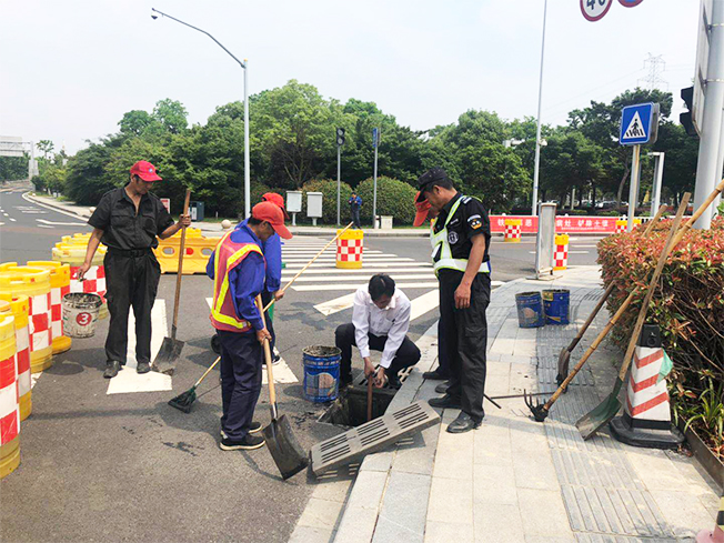 近期保安部協(xié)助保潔部進行高鐵場站的蓄發(fā)停車場、南一、二、三、四路的陰溝清理工作,保安對需要清理的陰溝區(qū)域進行安全圍擋,接著使用工具把需要清理的窨井蓋打開而保潔員隨后也緊跟著把漬泥雜物取出進行沖洗,部門之間相互配合使工作有序的進行著。在這期間保安部對管理范圍內的防汛重點區(qū)域、低洼易堵區(qū)域、地下室、等部位做為檢查重點,對排查出來的問題逐一研究落實,并將應急工作分布到位,做到各個區(qū)域都有直接責任人盡快予以解決,確保安全度汛。