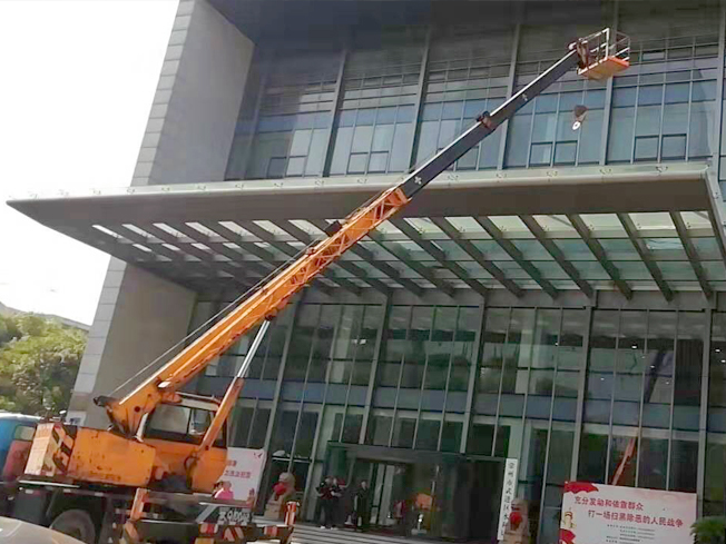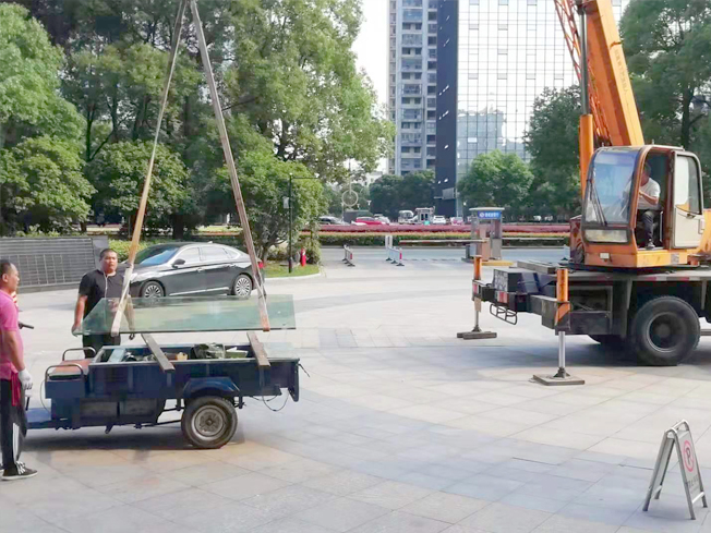 水務(wù)大廈南大門的鋼化玻璃雨棚,經(jīng)過數(shù)年的風(fēng)吹日曬、熱脹冷縮后,大塊的鋼化玻璃出現(xiàn)破碎、裂痕,給大樓的安全帶來了嚴(yán)重的隱患。為了避免一切安全隱患發(fā)生,2019年7月8日,管理部協(xié)同施工隊(duì)對(duì)雨棚進(jìn)行更換。由于大門口雨棚高度已經(jīng)達(dá)到八米,需要用吊機(jī)把碩大的玻璃吊上去,屬于高空作業(yè),我們管理部跟施工單位簽訂了安全協(xié)議,施工隊(duì)先是乘坐吊機(jī)升到雨棚上去把破損的玻璃更換下來,再用吊機(jī)把切割好的玻璃用吊帶捆好一塊一塊吊上去拼裝完工。夏日炎炎,施工隊(duì)的工人們汗流浹背卻不辭辛勞,更換完的玻璃雨棚清澈透亮,我們管理部協(xié)同施工隊(duì)的這次工程圓滿成功。