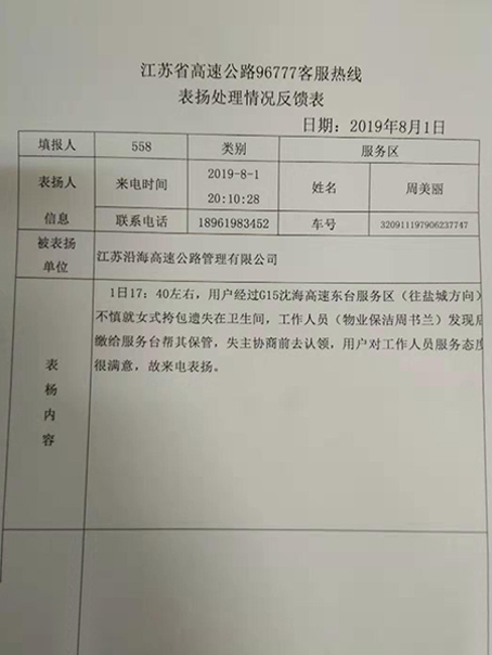 2019年8月1日17:50 分保潔員周書蘭吃過晚餐后回到崗位上,當(dāng)打掃至女衛(wèi)生間32號時(shí),發(fā)現(xiàn)行李架上有一個女式包,當(dāng)時(shí)第一反應(yīng)就是:包一定是顧客如廁后遺失的,顧客丟失后肯定著急,周書蘭立即打電話給現(xiàn)場值班管理員,管理員接報(bào)后第一時(shí)間趕到現(xiàn)場,領(lǐng)著周書蘭拿著包前去服務(wù)臺,在服務(wù)臺工作人員的見證下打開包,包內(nèi)有現(xiàn)金1505元,手機(jī)一部,身份證三張,戶口簿及各類證件和多張銀行卡,服務(wù)臺工作人員通過廣播尋找失主,通過10多分鐘不斷播放,但不見失主前來認(rèn)領(lǐng),失主有可能暫時(shí)未發(fā)現(xiàn)包已丟失,已經(jīng)離開服務(wù)區(qū),只好做好登記后存放在服務(wù)臺。18:53分失主發(fā)現(xiàn)包丟失,用其他手機(jī)打電話咨詢,經(jīng)確認(rèn)協(xié)商后,失主決定前來認(rèn)領(lǐng),失主于當(dāng)日20:10到達(dá)服務(wù)區(qū),經(jīng)現(xiàn)場確認(rèn)后,把包歸還給失主。失主拿到包后拿出500元以表謝意,被管理員婉言謝絕,跟他解釋這是我們義不容辭的責(zé)任。失主對工作人員的服務(wù)及員工拾金不昧的精神表示感謝!并致電96777反饋事情經(jīng)過,失主在服務(wù)臺前用手機(jī)發(fā)了條微博:(用最臟的手,掙最干凈的錢!請珍重奮戰(zhàn)在烈日下一線員工:由于天氣炎熱,室外氣溫高達(dá)35℃-40℃以上,請大家不要亂扔垃圾,有部分工人因天氣太熱入院,他們很多還是50--60歲以上的老人,而他們卻拾金不昧,不求點(diǎn)贊,只求轉(zhuǎn)發(fā)!還附上了幾張照片),8月2日96777發(fā)來表揚(yáng)信一份。