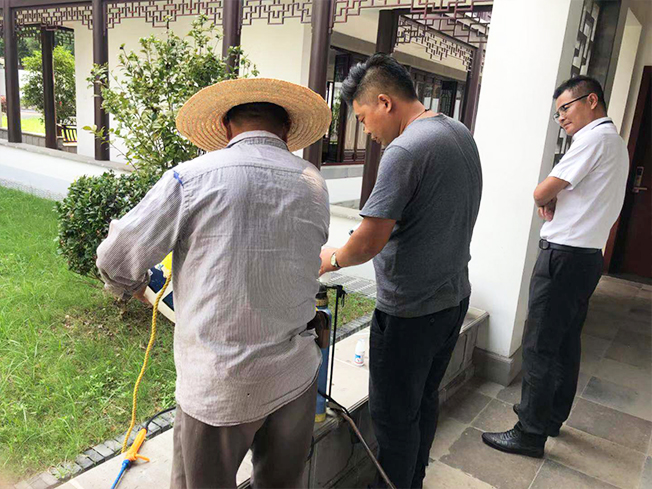 師傅到了現(xiàn)場做了簡單的查看,就開始準備工作。因為是上班時間,打藥的氣味相對有些重,噴藥前通知了每個辦公室關(guān)閉門窗,盡量減小對他們的辦公環(huán)境的影響。趙經(jīng)理相對專業(yè),對操作的師傅要求地面、走廊吊頂木頭裝飾都需噴灑到位,每個角落都需二道工序。要求區(qū)域處理完后,還有多余的藥水,趙經(jīng)理就帶著師傅把院子的綠植給灑了遍藥。