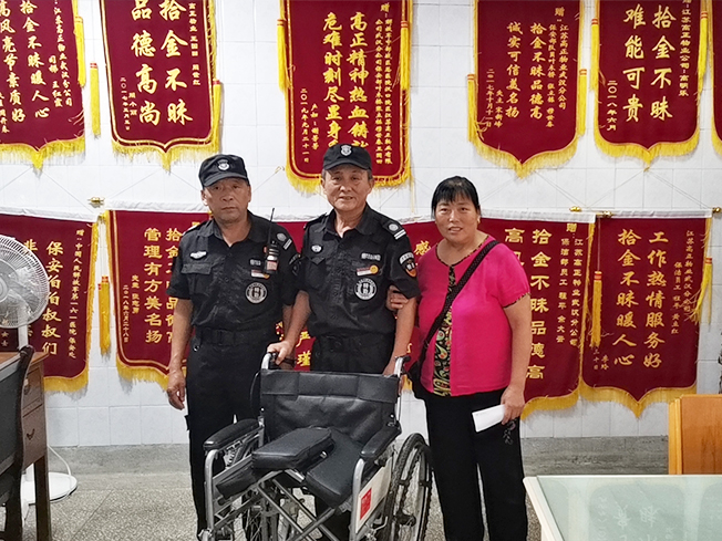9月4日中午12:00,項目經(jīng)理梁燕接到了住院部13樓康復(fù)理療科的護(hù)士長電話,說有病人在做康復(fù)理療時丟失一臺價值一千多元的輪椅,要求查看監(jiān)控,詢問如何辦理手續(xù)。項目經(jīng)理要求樓層保安進(jìn)行巡邏,查看是否有可疑人員,此時距離輪椅丟失已經(jīng)過了一個多小時。而上午,我們保安在醫(yī)技樓發(fā)現(xiàn)一部新輪椅,無人問津。滾動班的保安及時向班長葉木橋匯報了這一情況,葉班長意識到可能是病人丟失的,先收起來送到物業(yè)辦公室,并及時向項目經(jīng)理梁燕匯報了此事。梁經(jīng)理及時和康復(fù)科護(hù)士長反饋了這一情況。原來是護(hù)工在推病人做理療時,將輪椅遺忘在走道上,被其他做理療的病人推走,還好高正的保安及時發(fā)現(xiàn)并保管了這部新輪椅,護(hù)工阿姨為了表示感謝,特地做了一面錦旗,送到了物業(yè)辦公室。