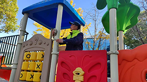 為了讓孩子們能在一個干凈、安全的環(huán)境中盡情玩耍,保潔人員付出了辛勤的努力。今天,保潔人員魏建明又拎著水桶、帶著抹布來到了這里。他先是仔細地檢查了每一個角落,不放過任何一處污漬和灰塵。接著,他用濕抹布認真地擦拭著攀爬架的扶手、滑滑梯的表面,一遍又一遍,不厭其煩。遇到頑固的污漬,他還會蹲下身子,用刷子用力地刷洗,直到污漬消失不見。在保潔人員魏建明的努力下,原本有些灰暗的游樂設施重新煥發(fā)出了光彩,變得干凈整潔。
