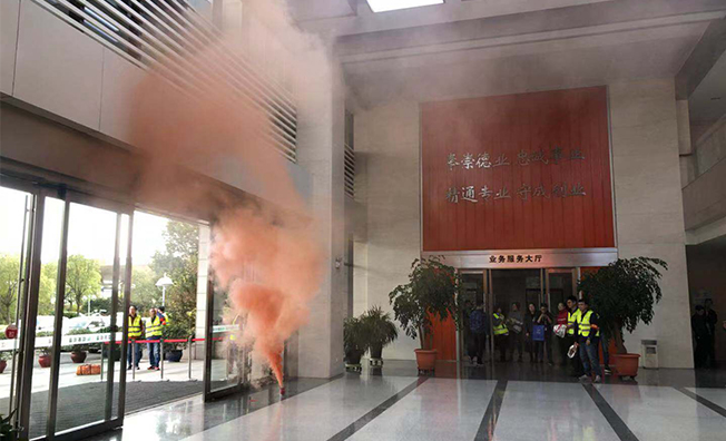 劉師傅和小陳協(xié)助甲方安放音響滅火器等實(shí)操用品,姜倩倩則需要配合甲方飾演火災(zāi)受傷人員模擬火災(zāi)救援。消防演習(xí)在點(diǎn)開(kāi)煙霧彈開(kāi)始,姜倩倩到二樓進(jìn)行配合劉師傅和小陳在b座后面的廣場(chǎng)進(jìn)行等待,其他人員在外圍等待甲方是否需要幫助。在大樓里的消防演習(xí)結(jié)束之后,指引員工到B座后面的廣場(chǎng)進(jìn)行干粉滅火器及消防水帶的使用方法進(jìn)行詳細(xì)的講解和實(shí)操示范。