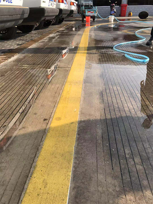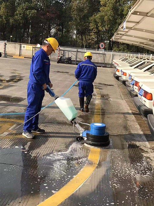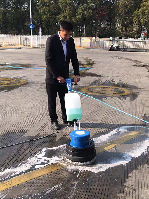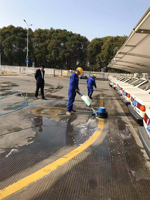 以前,清洗場(chǎng)地地標(biāo)線都是人工進(jìn)行清洗,不僅需要預(yù)備十幾個(gè)保潔員,且因保潔員在用地刷刷的時(shí)候用力有限的,清刷出來(lái)的地標(biāo)線仍有灰蒙蒙的。為此,我們物業(yè)在星期五下午不考訓(xùn)時(shí),將新配備的洗地機(jī)進(jìn)行了初步試用。因保潔員都未曾使用過(guò)此機(jī)器,項(xiàng)目經(jīng)理便親自進(jìn)行教授此機(jī)器用法及使用時(shí)需注意事項(xiàng),考慮到需要掌控機(jī)器的力較大,保潔員都是女士,無(wú)法將其掌控,便安排了一個(gè)維保員來(lái)進(jìn)行學(xué)習(xí)及后期的清洗工作。在學(xué)習(xí)會(huì)機(jī)器的使用方法后,便先對(duì)一段黃線地標(biāo)線進(jìn)行清洗,與未清洗的地標(biāo)線進(jìn)行對(duì)比,確實(shí)干凈很多,也亮了很多。看到效果后,我們便對(duì)E區(qū)整場(chǎng)地的地標(biāo)線進(jìn)行清洗。雖說(shuō)使用機(jī)器洗方便,不過(guò),因場(chǎng)地設(shè)計(jì)特殊性,還是安排了3-4名保潔員在機(jī)器清洗后,一個(gè)用水管清水進(jìn)行沖洗,其他保潔員用大竹掃帚進(jìn)行清掃,防止積水。最終,經(jīng)過(guò)一天的努力,終將E區(qū)場(chǎng)地黃色地標(biāo)線全部清洗干凈。