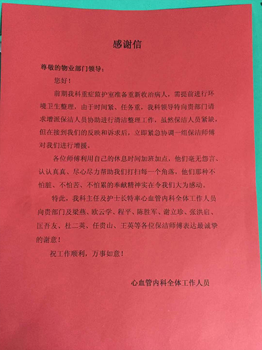 2018年9月24日中部戰(zhàn)區(qū)總醫(yī)院漢口院區(qū)維和英雄付森因感染惡性瘧原蟲陷入重度昏迷,醫(yī)院安排他住在19樓心血管科二病區(qū)ICU重癥監(jiān)護室,我們保潔師傅每天全副武裝進入ICU重癥監(jiān)護室進行衛(wèi)生清潔和消毒工作。不幸的是,在經(jīng)過專家和醫(yī)護人員400多天的守護下,于2019年11月26日7點59分遺憾離世。他去世火化后,我們接到醫(yī)院通知,對19樓心血管科二病區(qū)所有區(qū)域進行全方位,深度的清潔消毒。時間緊任務(wù)急,院方科室領(lǐng)導(dǎo)特向我們公司請求增派人員進行清潔整理工作,雖然我們保潔人員緊缺,但項目經(jīng)理梁燕帶領(lǐng)保潔主管程平、謝立珍、張洪其、杜二英和員工歐云學(xué)、陳勝軍、匡吾友、任貴山、王英等及利用中午休息時間加班加點,認認真真、盡心盡力把每一個角落進行清潔消毒,他們這種吃苦奉獻的精神讓院方本科室主任及護士長深為感動,特向我們高正物業(yè)寫來感謝信!