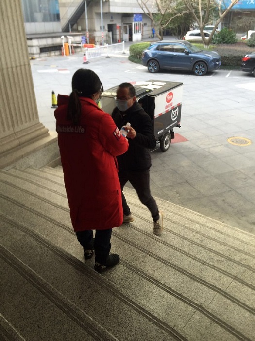 在大樓的證券公司業(yè)主向投資廣場項目部發(fā)來了緊急求援,他們的消毒水用的不夠了,這樣會大大降低每天防疫消殺作業(yè)效果。投資廣場項目部葉佳在自身防疫消毒水不足的情況下,主動提出可以帶一瓶消毒水給18樓業(yè)主。在全員帶口罩的情況下,要尋找辨認一個人還是比較困難的。只見葉佳每天早早就來到大樓的測溫點認真的給每一位進入大樓的工作人員測溫,一邊尋找業(yè)主。突然就見葉佳拿出一瓶消毒水跑下臺階給一個人,邊給邊說:“您好,您要的消毒水”,業(yè)主連連道謝。