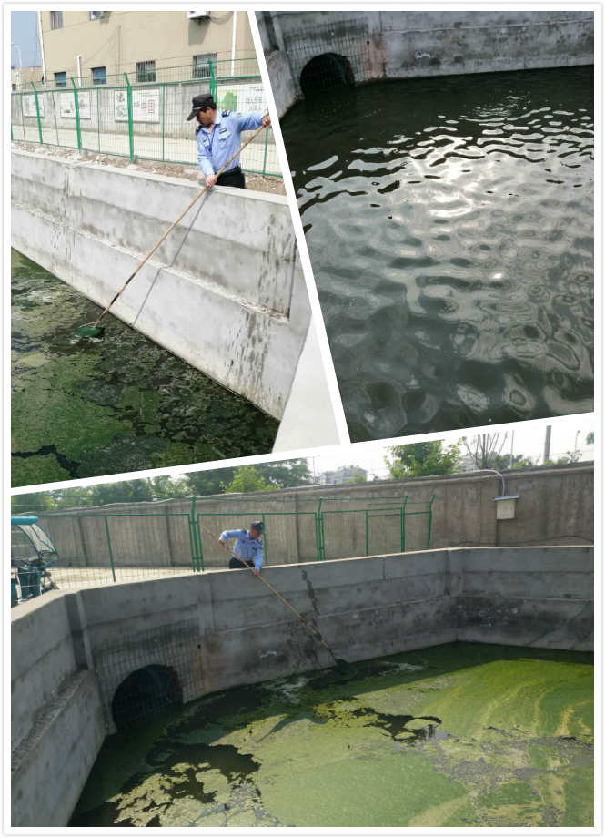 原來(lái)的污水溝水源質(zhì)量不行,含有的藻類(lèi)受到陽(yáng)光照射,產(chǎn)生光合作用,催生了微生菌,所以水中的綠色漂浮水藻、青苔類(lèi)較多,等氣溫升高,非常容易引起水質(zhì)發(fā)黑、發(fā)臭。我們安排安保人員用長(zhǎng)柄型的濾網(wǎng)斗進(jìn)行清掏打撈,并及時(shí)將打撈上來(lái)的垃圾清理運(yùn)走;同時(shí)對(duì)安保人員進(jìn)行安全培訓(xùn),在打撈期間注意自身的安全,防止跌落等意外發(fā)生,排除安全隱患。