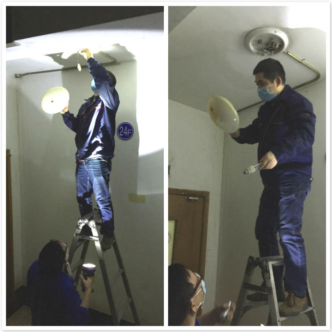4月8日,項(xiàng)目部巡檢人員在每天的樓層例行巡檢中發(fā)現(xiàn)24樓消防樓梯口上方的燈一閃一閃的,業(yè)主出行存在安全隱患。為了保證業(yè)主的出行安全,項(xiàng)目部的巡檢人員立馬打電話報(bào)給工程部的師傅們。工程部的陶師傅在接到報(bào)修電話后立馬和另一位孫師傅扛上三角梯并拿上新的燈管直上24樓。只見陶師傅爬上撐梯小心翼翼的打開燈罩一邊查看問題,一邊熟練的拔下插在燈罩上的兩根電線,在斷電的情況下孫師傅一邊舉著手電筒給陶師傅照明,一邊嘴里叮囑著:“小心,注意安全”。陶師傅在查找原因中發(fā)現(xiàn)是因?yàn)闊袅習(xí)r間長,老化了。陶師傅迅速拿出新的燈管裝上,在新的燈管裝上的瞬間樓梯間明亮了許多。陶師傅看燈亮了,又試了幾次確定沒有問題以后一邊下?lián)翁菀贿呎f:“這下業(yè)主出行安全了,不會(huì)看不清了”。