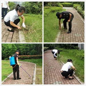 針對這種情況,高正集團項目部的丁主管帶領物業(yè)人員一起鋤草,噴灑殺蟲劑,充分發(fā)揮我們物業(yè)人不怕苦、不怕累的精神。保潔阿姨和保安分工明確,配合默契,保潔阿姨有的用手拔,有的用小鏟刀,有的負責清理現(xiàn)場;保安噴灑藥水,在大家齊心協(xié)力下,整個綠化帶煥然一新。