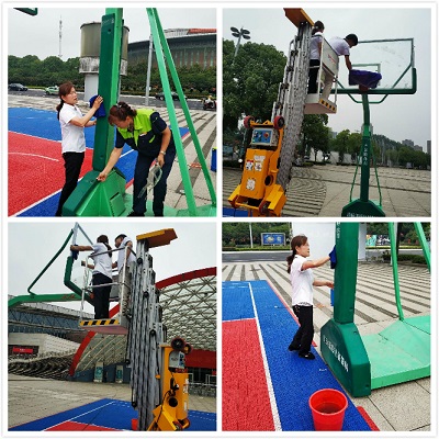 近期3V3籃球賽即將在奧體會(huì)展中心前面的廣場(chǎng)上舉行,甲方安排師傅們把籃球框安裝好后發(fā)現(xiàn)籃板上比較臟,需要清理干凈,就打電話給奧體中心項(xiàng)目部,溝通希望保潔去清理下。