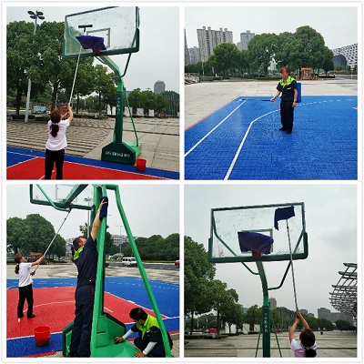 經(jīng)過半小時(shí),大家把籃板弄得干干凈凈,最后地面上還噴灑了消毒劑。甲方領(lǐng)導(dǎo)來看后非常滿意,稱贊我們做事細(xì)心、靈活。