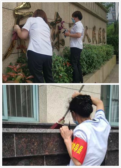 當(dāng)巡查到大門口的時候,看到"啟東市人民醫(yī)院"的大黃金字上有不少灰塵,由于工友們都在自己的崗位上忙于自己的工作,項(xiàng)目部管理人員就自己拿來毛巾擦了起來。