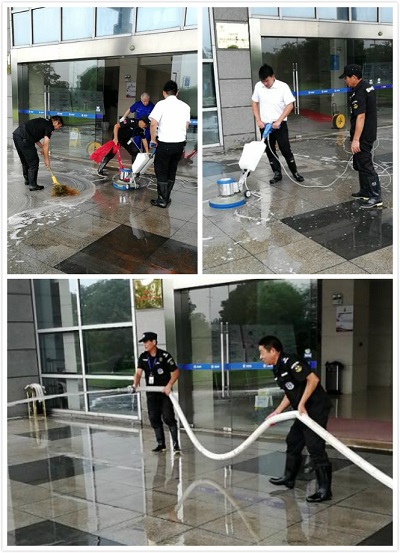 今天趁著下雨,公路事業(yè)發(fā)展中心的丁主管,和其他工作人員準(zhǔn)備把大樓前后廳的地面徹底清洗一下。首先把肥皂粉放入一大桶水中,幾個(gè)保安師傅和丁主管一起忙活,清洗之前,先把肥皂水噴灑在地面上,然后用我們的手推式清洗機(jī)開(kāi)始清洗。丁主管和我們的老蔣師傅兩個(gè)人配合默契清洗地面,剛開(kāi)始的時(shí)候,有點(diǎn)難度,但是只要掌握了方法,清洗起來(lái)就很容易了。其他人在一旁一邊掃地一邊沖水,由于天氣悶熱,幾個(gè)人熱的都汗流浹背,豆大的汗珠如同雨水般不停滴落,從臉上落到衣襟上,衣服都濕透了,為了讓門(mén)廳更加整潔清爽,再苦再累這也是值得的。
