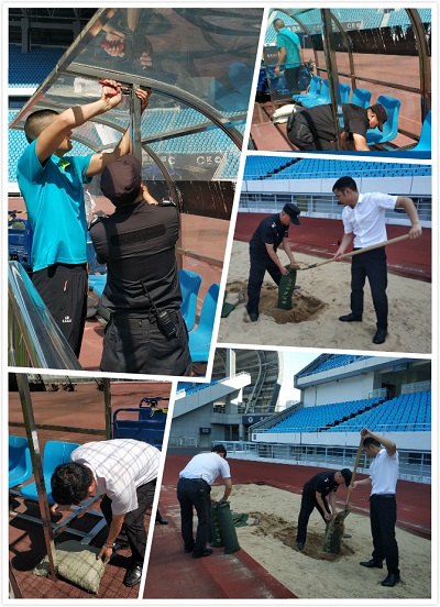 經(jīng)巡查發(fā)現(xiàn),奧體中心田徑場跑道周邊有一些遮陽棚,由于風大可能會發(fā)生后翻的情況,造成物品損壞,如果壓到人,那就更危險了,所以需要提前加固,杜絕安全隱患。之前防汛用的沙袋還有剩余在項目上,現(xiàn)在正好可以派上用場了。于是,保安主管帶著隊長和幾個保安,把防汛沙袋里灌滿沙子,壓在座位下面的欄桿上,壓實后上面欄桿處又用鐵絲綁牢加固。