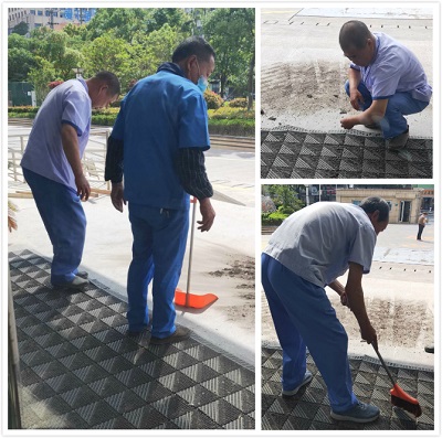 于是,主管連忙打電話給醫(yī)院總務科說明情況,他們立即派了兩個木匠先把損壞的玻璃門敲下來。由于敲的時候碎小的玻璃灑落在門外面的防滑墊子上,有一定的安全隱患,所以主管馬上安排項目上的機動工友開始清理碎玻璃片,并將之前堆積的灰塵全部清理干凈。他們先把防滑墊翻過來,把能拍掉的碎屑先拍掉,再用手把剩余的拍不出來的碎玻璃一點一點撿起來,撿的差不多了,再把防滑墊放回原地,并且將防滑墊四邊踩平,最后,三個師傅再把清理出來的垃圾全部清理掉。