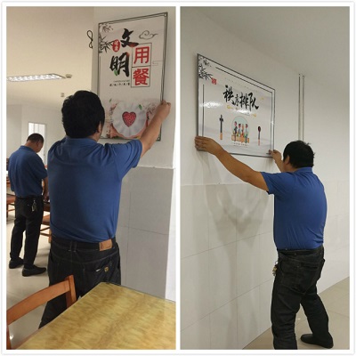 宣傳畫張貼好后,瞬間覺得食堂變得多姿多彩了,不再是單調(diào)的白。項(xiàng)目部做事的高效與時(shí)效性給甲方領(lǐng)導(dǎo)留下了深刻的印象,得到了領(lǐng)導(dǎo)的贊賞。