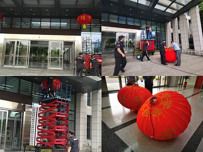 項(xiàng)目主管還提前準(zhǔn)備了大紅燈籠,由于掛燈籠區(qū)域比較高,保安師傅推來了升降機(jī),感謝他們不懼危險(xiǎn)和辛苦,為平時(shí)莊嚴(yán)肅靜的大門增添了一份喜慶和歡樂的節(jié)日氛圍。