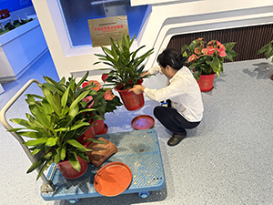 綠化人員送來了新鮮的盆栽,保潔班長分工合作,全體保潔把自己崗位綠植品種領(lǐng)走更換。她們先把快要枯萎的綠植從盆栽里拿出來然后換上新的綠植,新的綠植全部到位,再拿來裁紙刀把綠植花盆邊緣都修的整整齊齊,擦得干干凈凈。整個過程大家一氣呵成,完成了整棟辦公大樓的綠植更換,并把所有樓層修剪花盆的垃圾全部清理打掃干凈。
