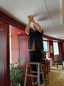為了迎接客人的到來,項(xiàng)目管理人員及時(shí)對(duì)客梯進(jìn)行梯控,節(jié)約了集團(tuán)客人等待時(shí)間。會(huì)議室提前開燈,空調(diào)調(diào)至舒適的溫度,準(zhǔn)備茶水,配合集團(tuán)人員擺放席卡。突然我們發(fā)現(xiàn)會(huì)議室有一個(gè)燈毫無規(guī)律的閃爍,距離會(huì)議開始僅剩半小時(shí),為了給客人一個(gè)舒適的開會(huì)環(huán)境,我們趕緊和工程部戴師傅取得了聯(lián)系,師傅拿上工具及時(shí)趕到,架起梯子開始檢修。經(jīng)過排查是線路有些接觸不良,師傅抓緊時(shí)間把線路整理安裝并固定到位,會(huì)議室又恢復(fù)了之前的明光爍亮。