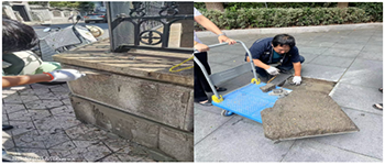 近日,投資廣場(chǎng)項(xiàng)目部在巡邏時(shí)發(fā)現(xiàn)圍墻外圍一塊墻體磚脫落,廣場(chǎng)上的地磚由于車輛的碾壓翹起,這樣既有礙美觀又存在安全隱患。為了確保業(yè)主能順暢安全出行,工程部師傅帶著鐵鍬和榔頭,等車流高峰期過(guò)后才開始維修,戴師傅從倉(cāng)庫(kù)拿來(lái)之前裝修剩下的水泥材料,擼起袖子就開始修補(bǔ)和平整工作。他先撿起掉落的磚塊放回原位找平,再用水泥澆灌鋪平,在戴師傅精湛的手藝下,墻體被恢復(fù)如初。戴師傅說(shuō)這是項(xiàng)長(zhǎng)期工作,以后的每個(gè)夏天都需要每天撒一次水,要不然容易開裂。