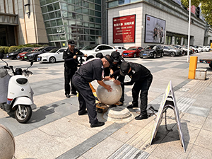 幸運的是,這一幕被巡邏至此的保安及時發(fā)現(xiàn)。面對這突如其來的龐然大物,他迅速作出反應(yīng),第一時間通過對講機上報給值班主管。主管深知情況緊急,不僅因為這石球又大又重,可能對過往行人及車輛構(gòu)成威脅,更因它的意外移動可能暴露出更多安全隱患。接到報告后,主管立即調(diào)集了數(shù)名身強力壯的保安隊員,并拉來一輛小型拖車前往現(xiàn)場支援。大家首先小心翼翼地用繩索固定住石球,防止其進一步滾動。隨后,幾位保安合力將石球緩緩?fù)葡蛲宪,每一步都顯得異常艱難卻又堅定有力。經(jīng)過一番努力,石球終于穩(wěn)穩(wěn)當當?shù)乇话仓迷诹送宪嚿稀>o接著,保安們利用專業(yè)工具,將石球重新安置在原本的位置上,并用更加牢固的方式固定好,確保類似情況不再發(fā)生。