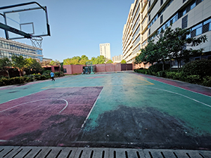 今日下午,院方臨時(shí)通知即將舉行一場趣味運(yùn)動會。接到通知后,項(xiàng)目部迅速展開行動,對籃球場進(jìn)行了一次突擊清理。由于籃球場施工工藝原因,地面出現(xiàn)起皮脫落現(xiàn)象,加之日常使用頻繁,污漬緊緊嵌入在裂縫中,使得整個籃球場顯得非常臟亂。