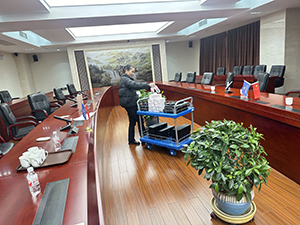 接甲方領(lǐng)導(dǎo)通知,北京特檢院院長一行和江蘇特檢院長交流會將在低溫中心召開。本著給領(lǐng)導(dǎo)留下美好印象的目的,物業(yè)根據(jù)參會流程,全體物業(yè)人員各司其職、各盡職責(zé),齊行動。院區(qū)地面及接待室、會議室阿姨再次精細(xì)打掃擦拭,各樓層綠植修剪。保安負(fù)責(zé)車輛引導(dǎo)停放,車輛停放忙而不亂。根據(jù)參觀路線,阿姨們把各自負(fù)責(zé)的片區(qū)細(xì)節(jié)衛(wèi)生徹底清潔,外圍保潔師傅負(fù)責(zé)把院區(qū)門牌及小公園設(shè)施都全部擦拭一遍,B、C兩個(gè)車間的地面,墻壁,玻璃以及門框也徹底大掃除。同時(shí),會務(wù)也按照參會人員名單準(zhǔn)備席卡、話筒、臺板、筆、毛巾和各種會議所需物品,都秉著所有的物品在同一直線上的標(biāo)準(zhǔn)依次擺好。工作部署有條不紊全部到位,院領(lǐng)導(dǎo)對我們的工作甚是滿意。