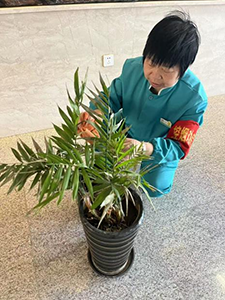 保潔員們手持柔軟的抹布,小心翼翼地擦拭著每一片綠植的葉片。他們細(xì)致入微,不放過任何一個(gè)角落,哪怕是葉片上最細(xì)微的灰塵,都被認(rèn)真地清理掉。那專注的眼神,仿佛在與每一株綠植交流,傳遞著對(duì)生命的尊重與關(guān)愛。