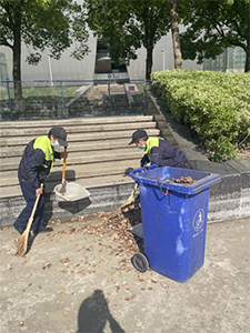 首先,保潔人員們小心翼翼地將落葉掃到一起,隨著掃帚的揮動,一片片落葉被聚攏成堆,宛如一個個金色的小山丘。接下來,這些落葉被逐一撿起,輕輕地放入準(zhǔn)備好的垃圾桶中。保潔人員們分工明確,有的負(fù)責(zé)清掃,有的負(fù)責(zé)收集,整個流程井然有序。