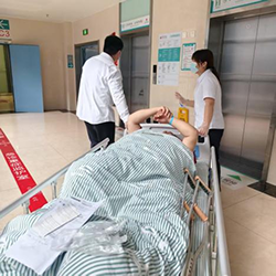 當(dāng)清晨的第一縷陽(yáng)光透過(guò)窗戶,照進(jìn)了繁忙的醫(yī)院大廳。一站式的客服接到6樓內(nèi)分泌科護(hù)士長(zhǎng)的電話,說(shuō)有一位特殊病人,因?yàn)轶w型比較胖(300斤左右)加上行動(dòng)不便,運(yùn)送來(lái)的兩位阿姨推不動(dòng),需要一位男士來(lái)幫忙,這時(shí)身為儲(chǔ)備的梁濤聽到,第一時(shí)間來(lái)到6樓病人汪大哥身邊,把汪大哥從住院部推到門診做檢查,因?yàn)榉逝旨由贤刃袆?dòng)不便,汪大哥情緒非常的焦慮與不安。梁濤主動(dòng)上前與汪大哥搭話,不僅耐心地向他解釋了檢查的整個(gè)流程,還用自己的親身經(jīng)歷安慰她,在梁濤的陪伴下汪大哥緊張的情緒逐漸得到緩解,整個(gè)過(guò)程變得不再那么害怕與焦慮。