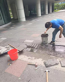 維修師傅們帶著撬棍、水平尺等工具逐段排查,對于空鼓地磚,小心撬開舊磚后清理基層雜物,按比例調(diào)配水泥砂漿重新粘貼。烈日下地面溫度灼人,汗水順著額頭滴落在磚縫里,但師傅們?nèi)詫W⒂诿恳淮吻么、每一度找平,讓修?fù)后的地磚與周邊嚴絲合縫,重現(xiàn)平整光潔。
